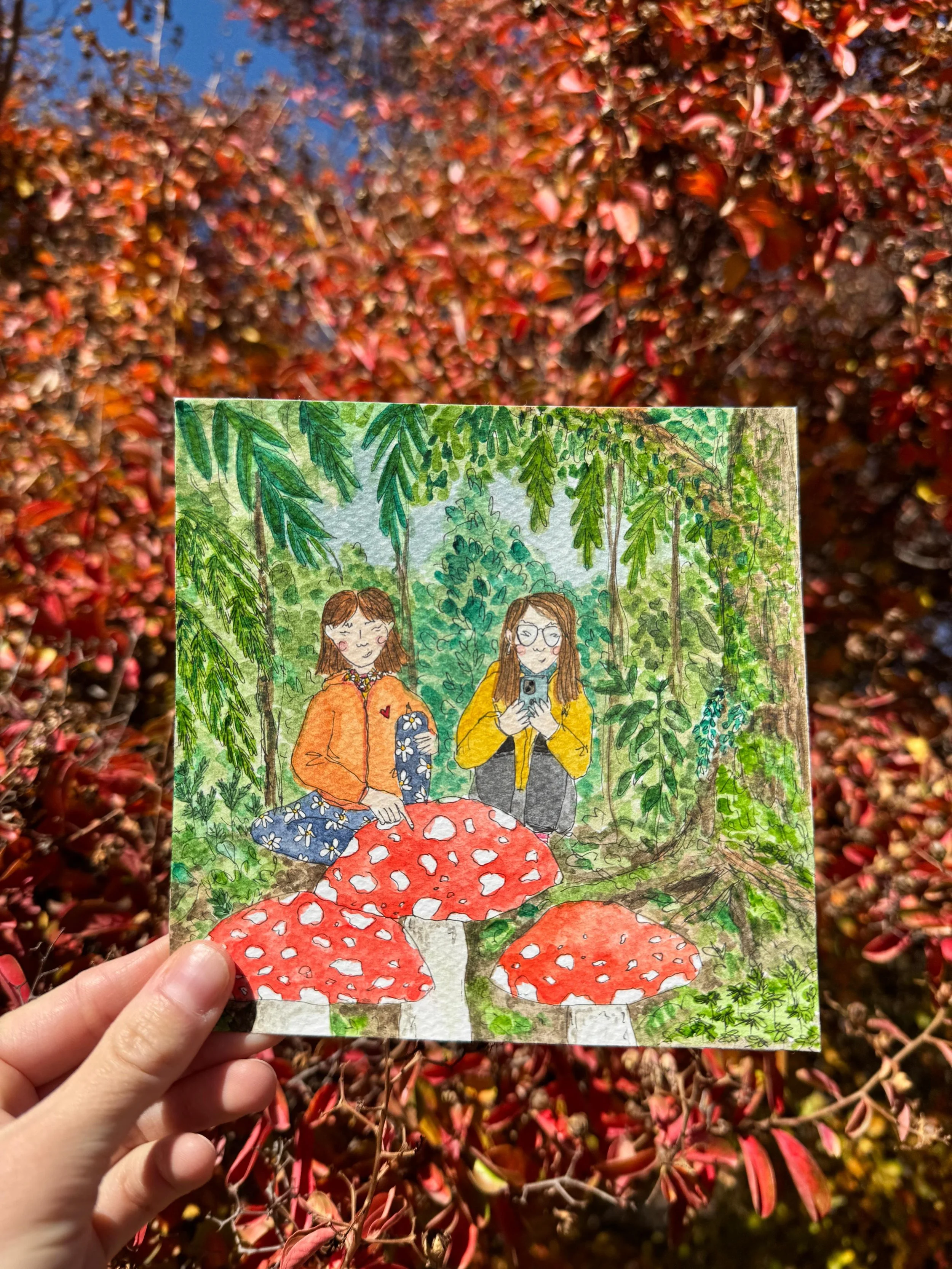 A painting for my friend, Ale, who works for the Fungi Foundation and is a fellow mushroom fanatic. Here we are, as our plant character versions, exploring the fungi in the Chilean temperate rainforest.
